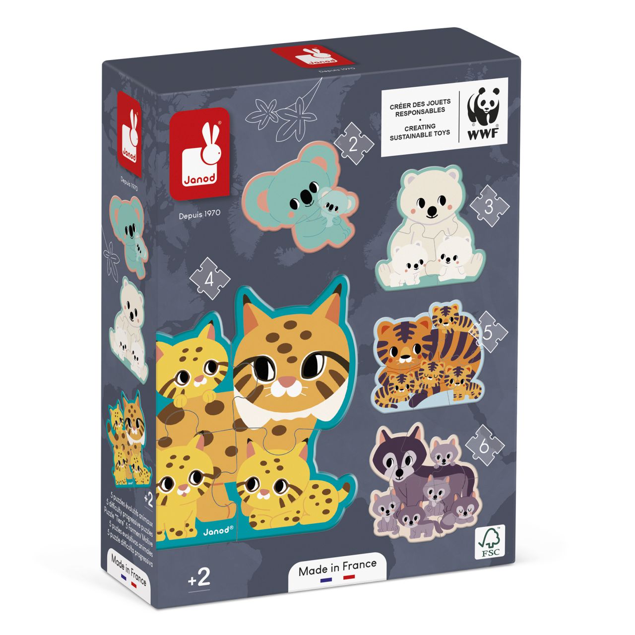 Un surtido de 5 puzles evolutivos con la temática de los animales. El número de piezas corresponde al número de animales de la ilustración y aumenta progresivamente para acompañar al niño en su progreso. Además, un contorno de color facilita el reconocimiento de las diferentes piezas. Los puzles están compuestos por 2, 3, 4, 5 y 6 piezas. Cartón con certificación FSC y tintas vegetales. Fabricado en Francia.
